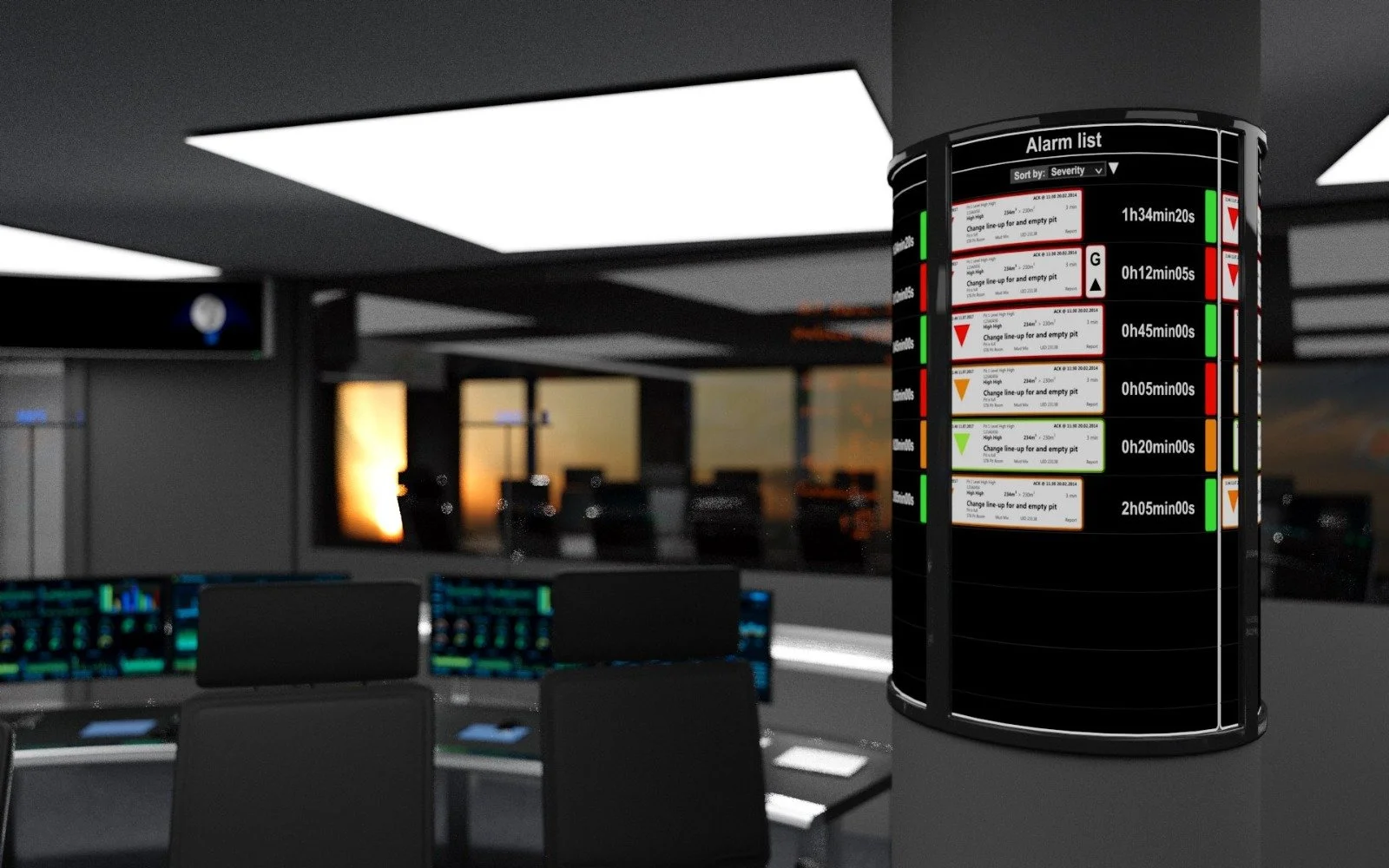 RIVOPS, is 3D alarm overview panel. This is a visual summary of the alarm list connected to the main OPCUA Alarm & Event server. The 3D floorplan of the factory is used to display alarms using transparency layers, automatic camera views.